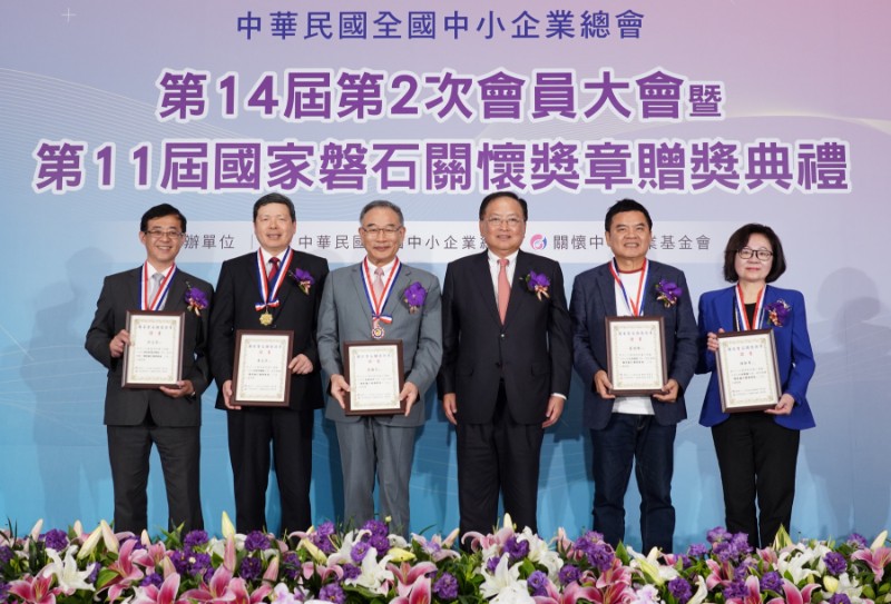 左起:臺北科技大學管理學院范書愷院長、台灣中小企業聯合輔導基金會徐定禎董事長、關懷中小企業基金會李成家董事長、卓榮泰院長、中華民國全國中小企業總會李育家理事長、臺灣證券交易所李愛玲總經理、立法院賴瑞隆立法委員、今周刊總編輯許秀惠總編輯